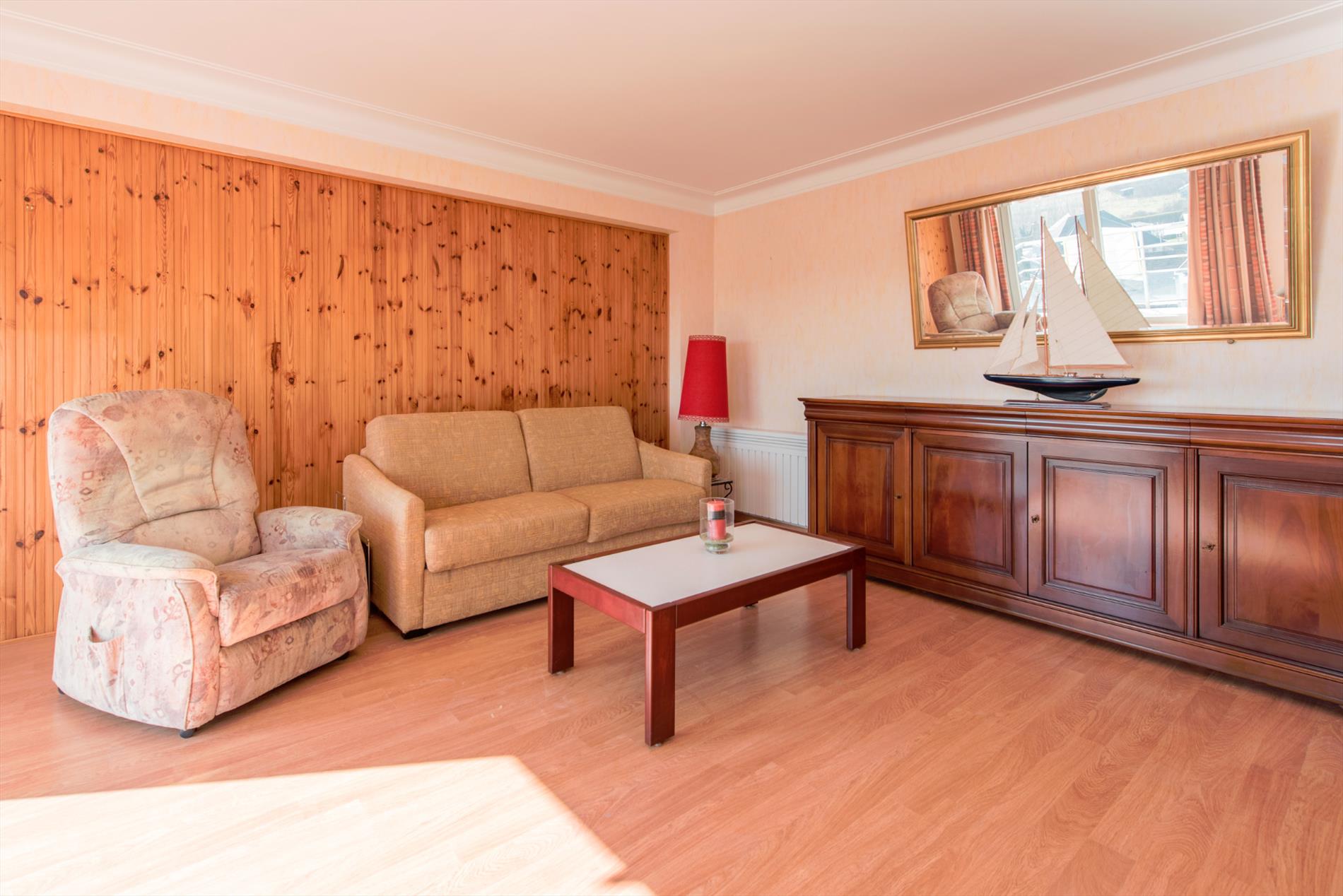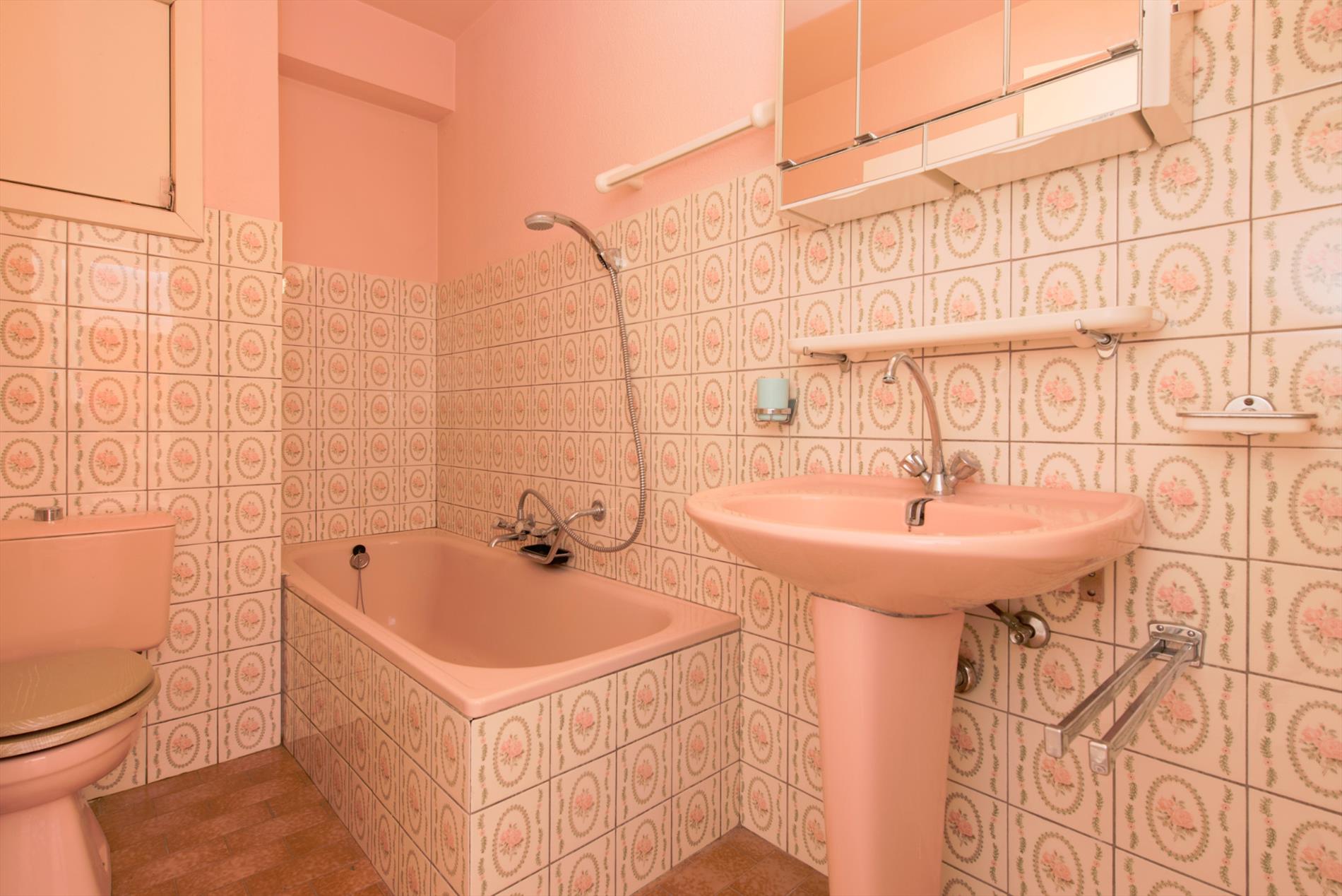 Ruime woonkamer met halfopen keuken, badkamer met ligbad en toilet.