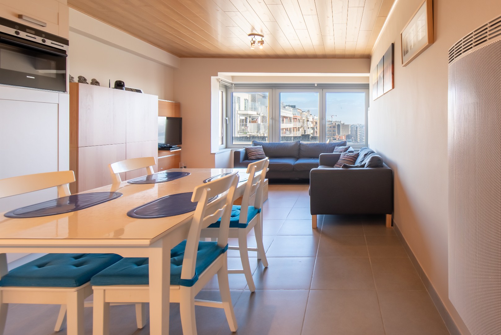 Prachtig gerenoveerd appartement op de 9de verdieping van een rustige residentie, vlak bij het centrum van Middelkerke. De ruime, lichtrijke woonkamer biedt een aangenaam zijdelings zicht op zee. De open keuken werd volledig vernieuwd en uitgerust met alle hedendaags comfort.