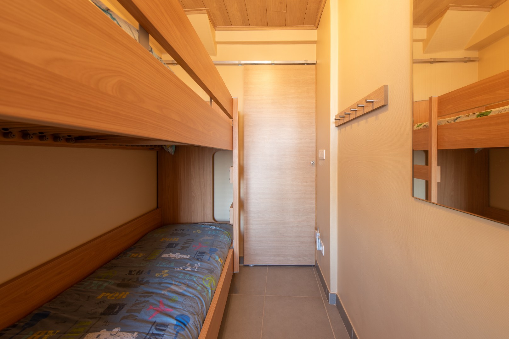 De grote badkamer beschikt over een douche, wastafel en toilet. In de slaapkamer is plaats voor een dubbel bed en een stapelbed, ideaal voor eigen gebruik of verhuur.
