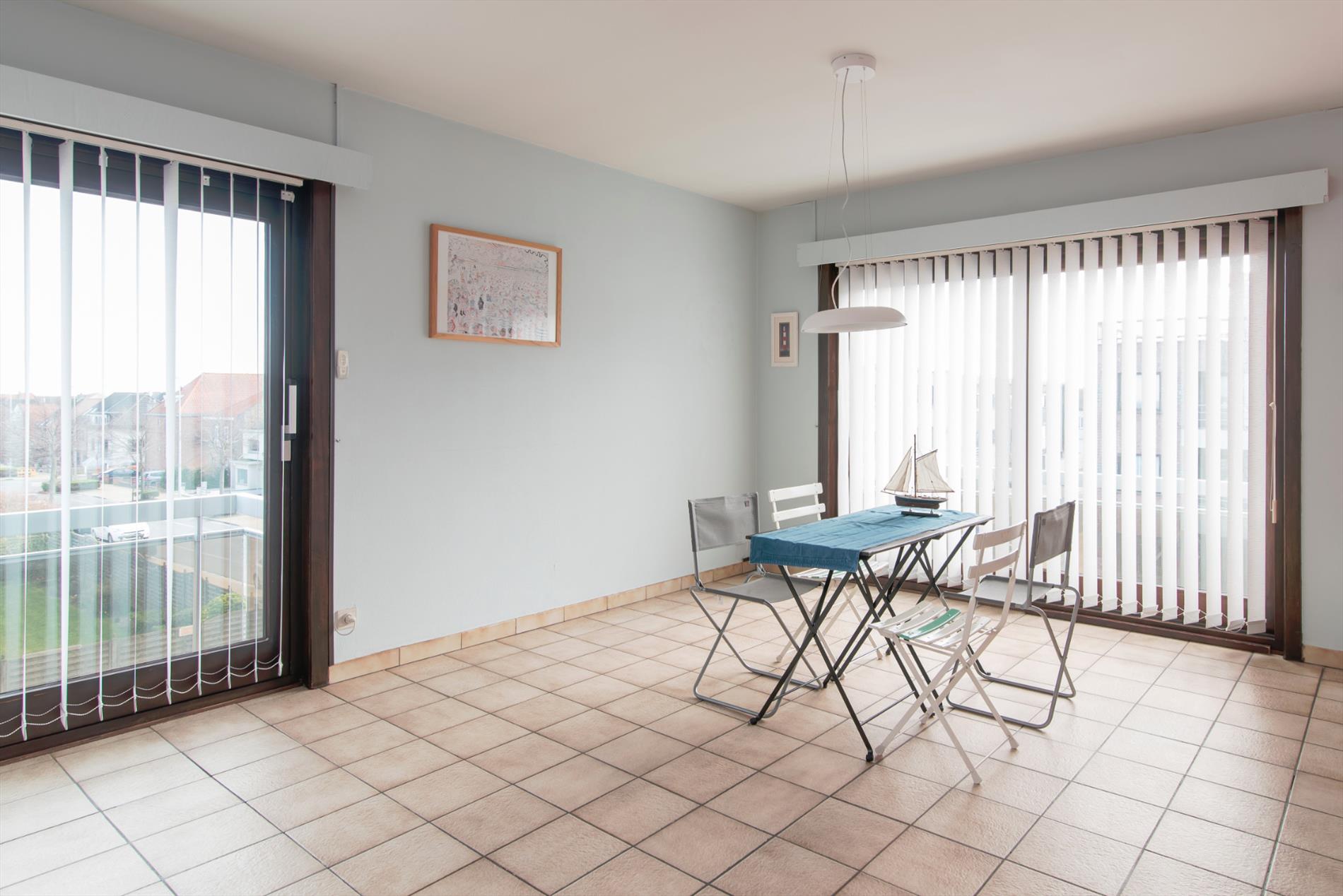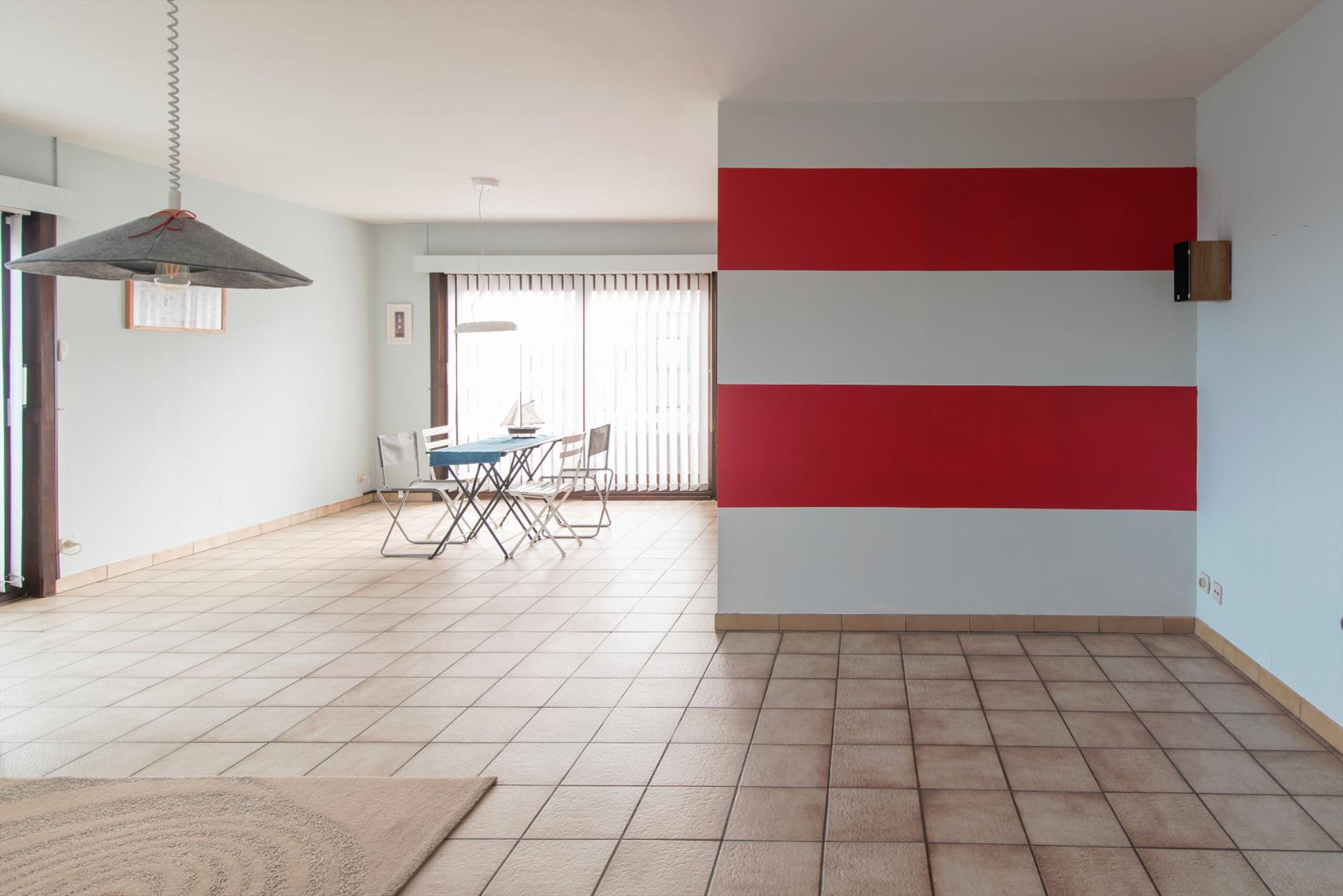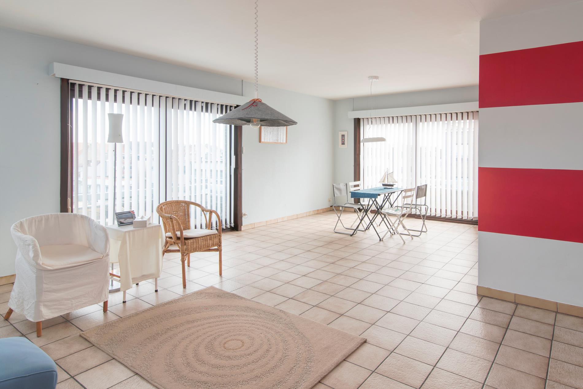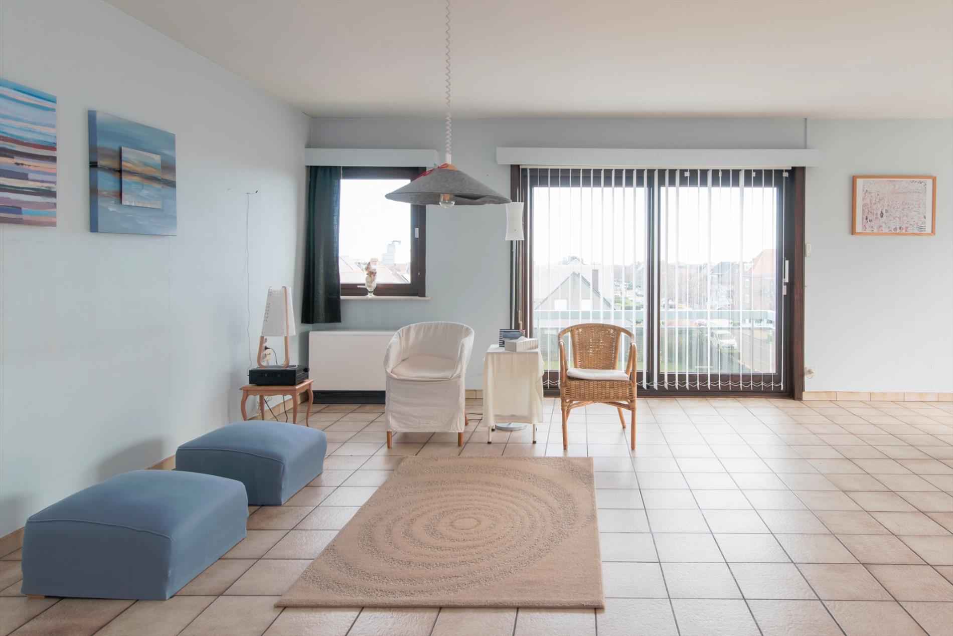 Tweede verdieping. Zonnige woonkamer met ruime zit- en eethoek. Terras met zijdelings zeezicht. Afzonderlijke ingerichte keuken. Badkamer met ligbad, wastafel, toilet en aansluiting wasmachine. Twee slaapkamers. Grote berging. Privé kelder. Zeer lage syndic kosten.