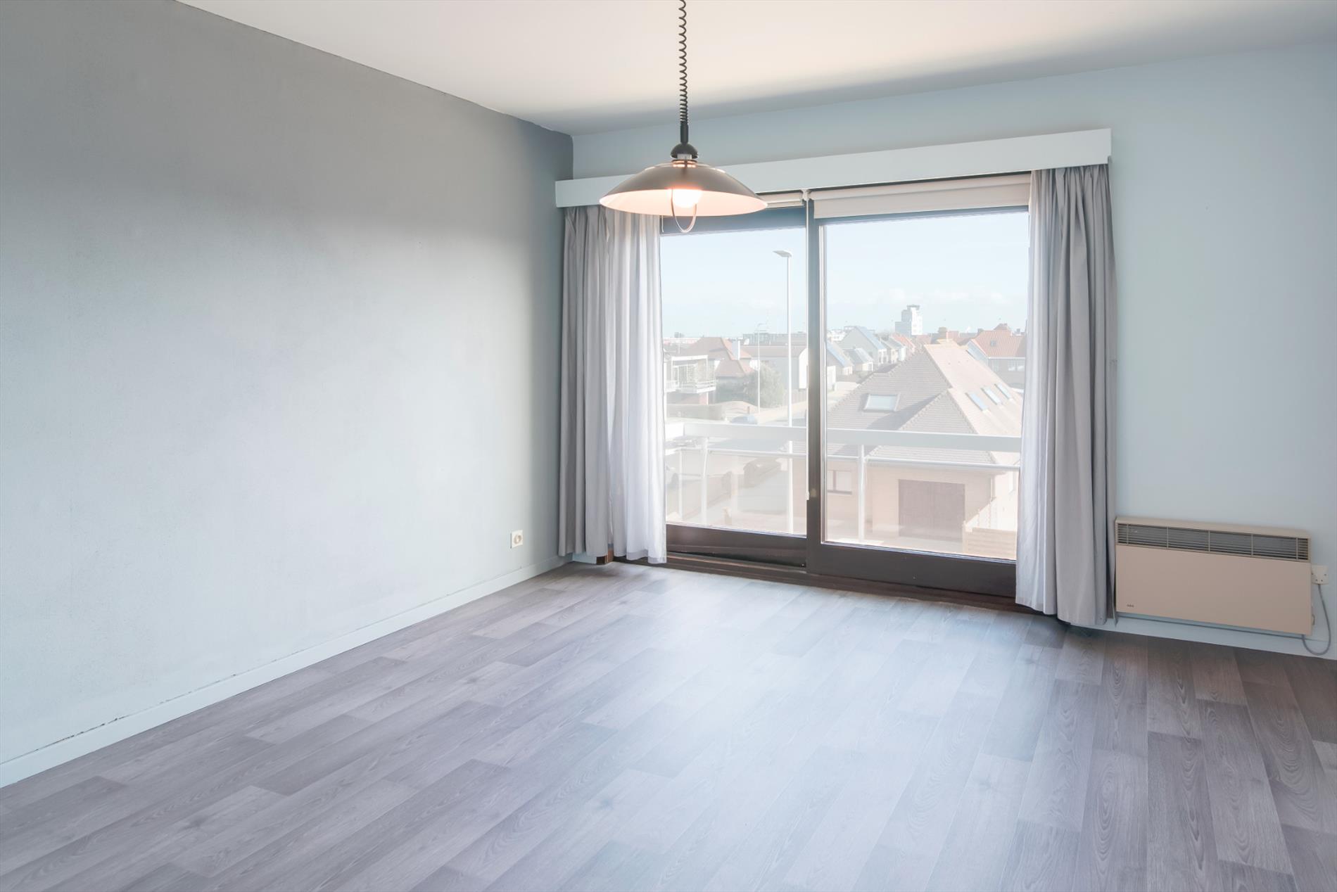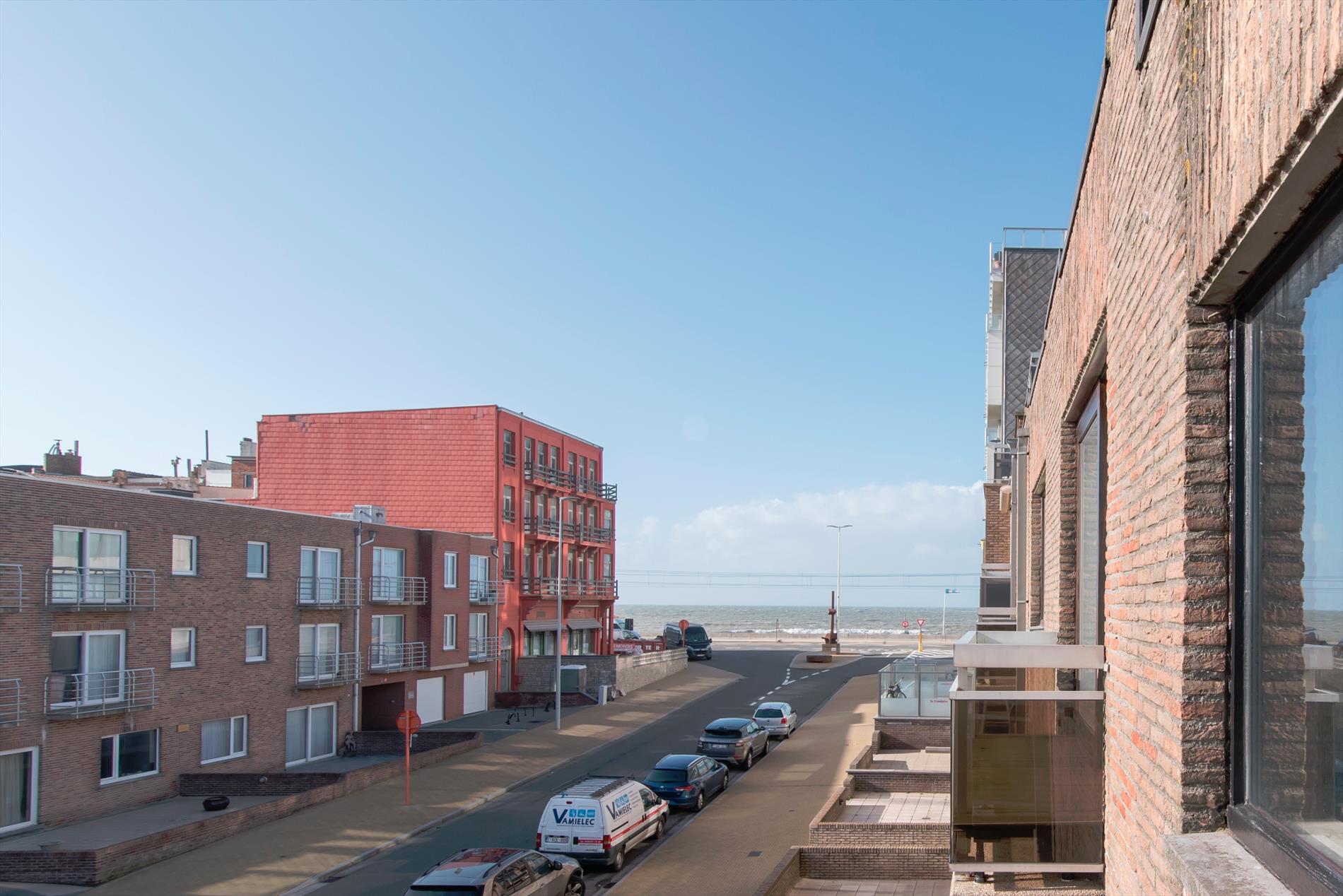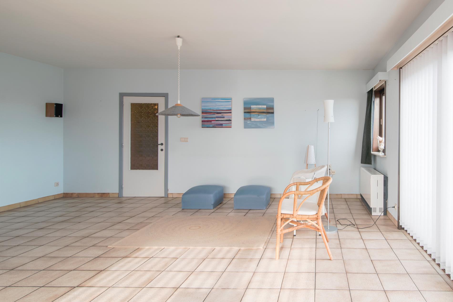 Tweede verdieping. Zonnige woonkamer met ruime zit- en eethoek. Terras met zijdelings zeezicht. Afzonderlijke ingerichte keuken. Badkamer met ligbad, wastafel, toilet en aansluiting wasmachine. Twee slaapkamers. Grote berging. Privé kelder. Zeer lage syndic kosten.