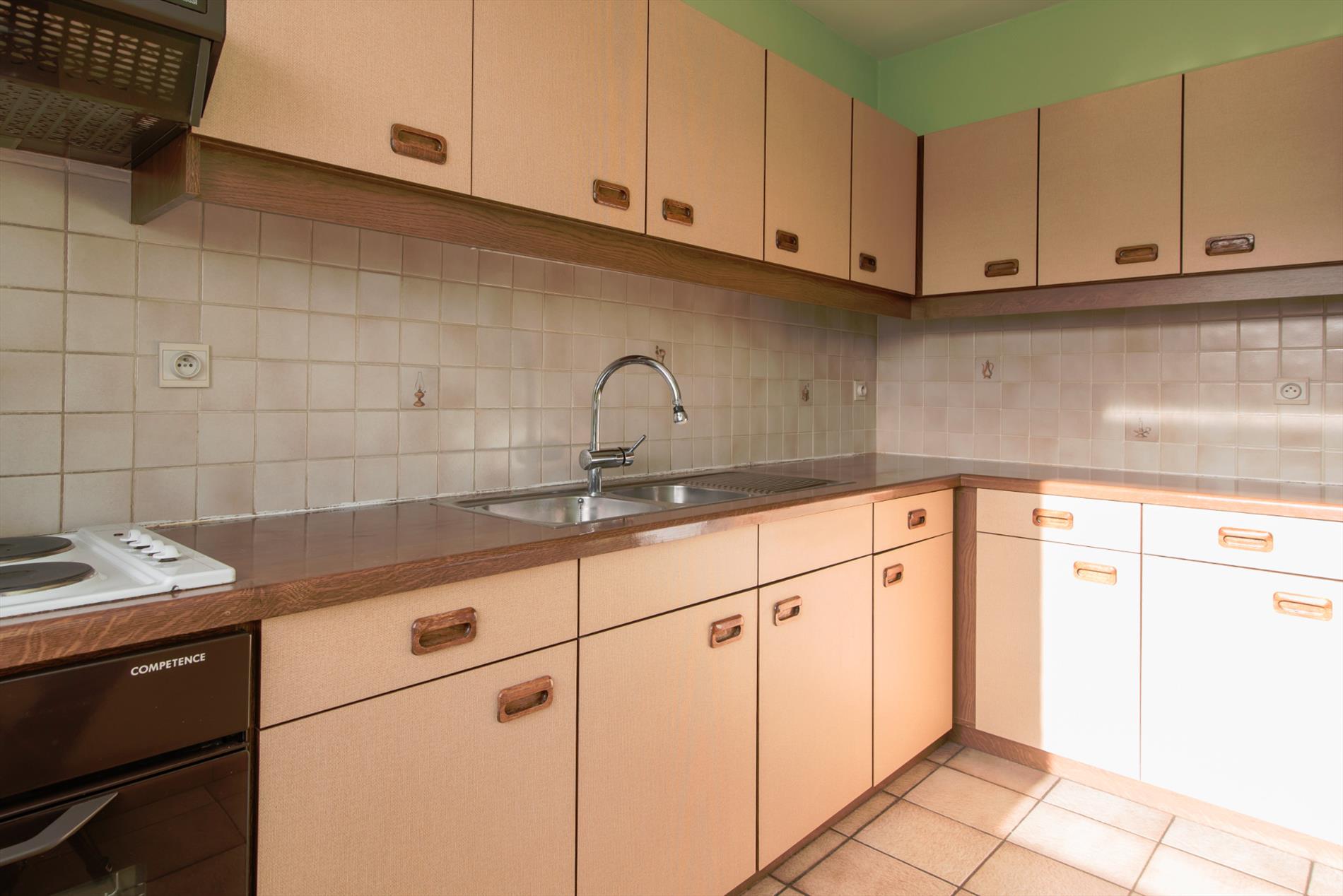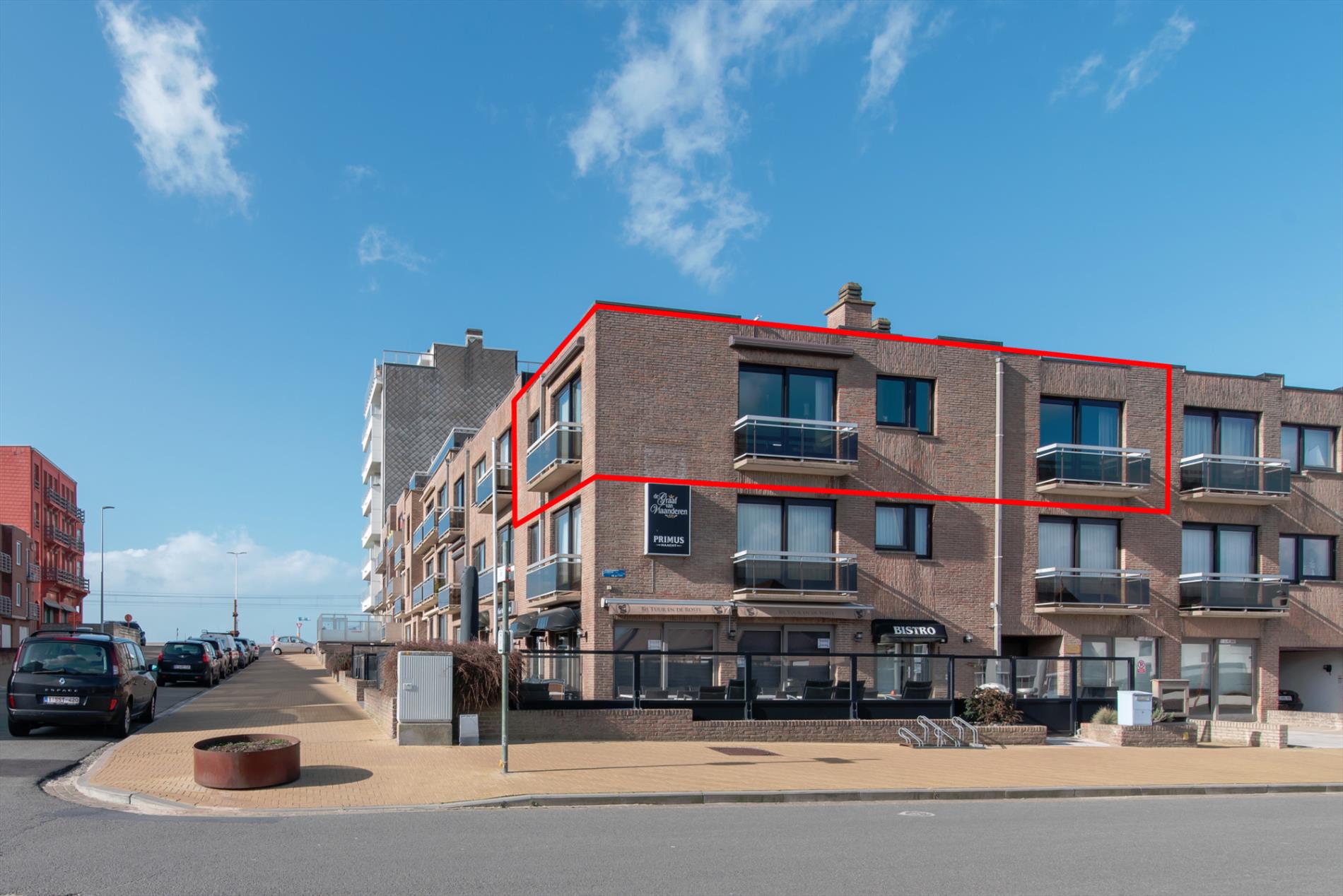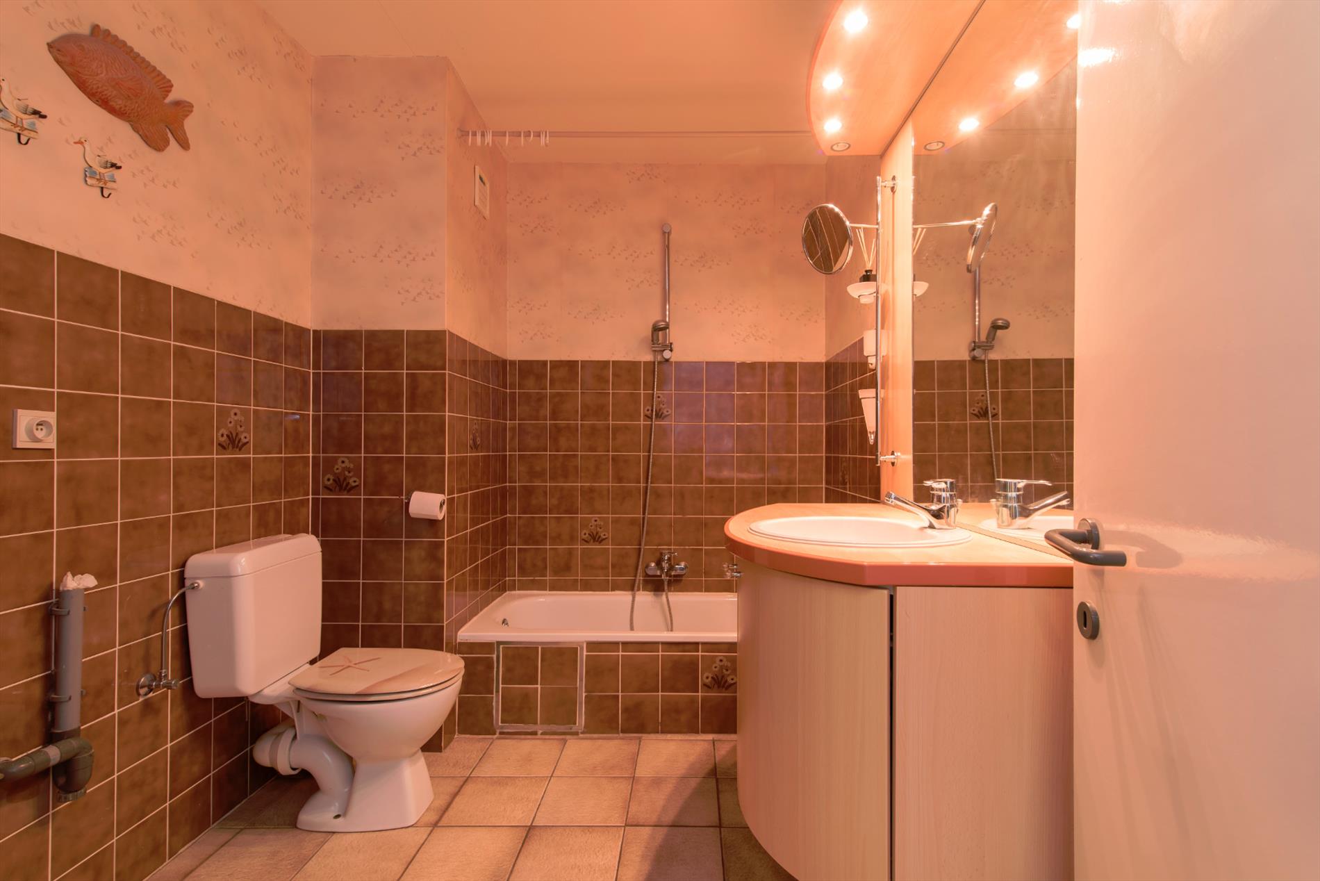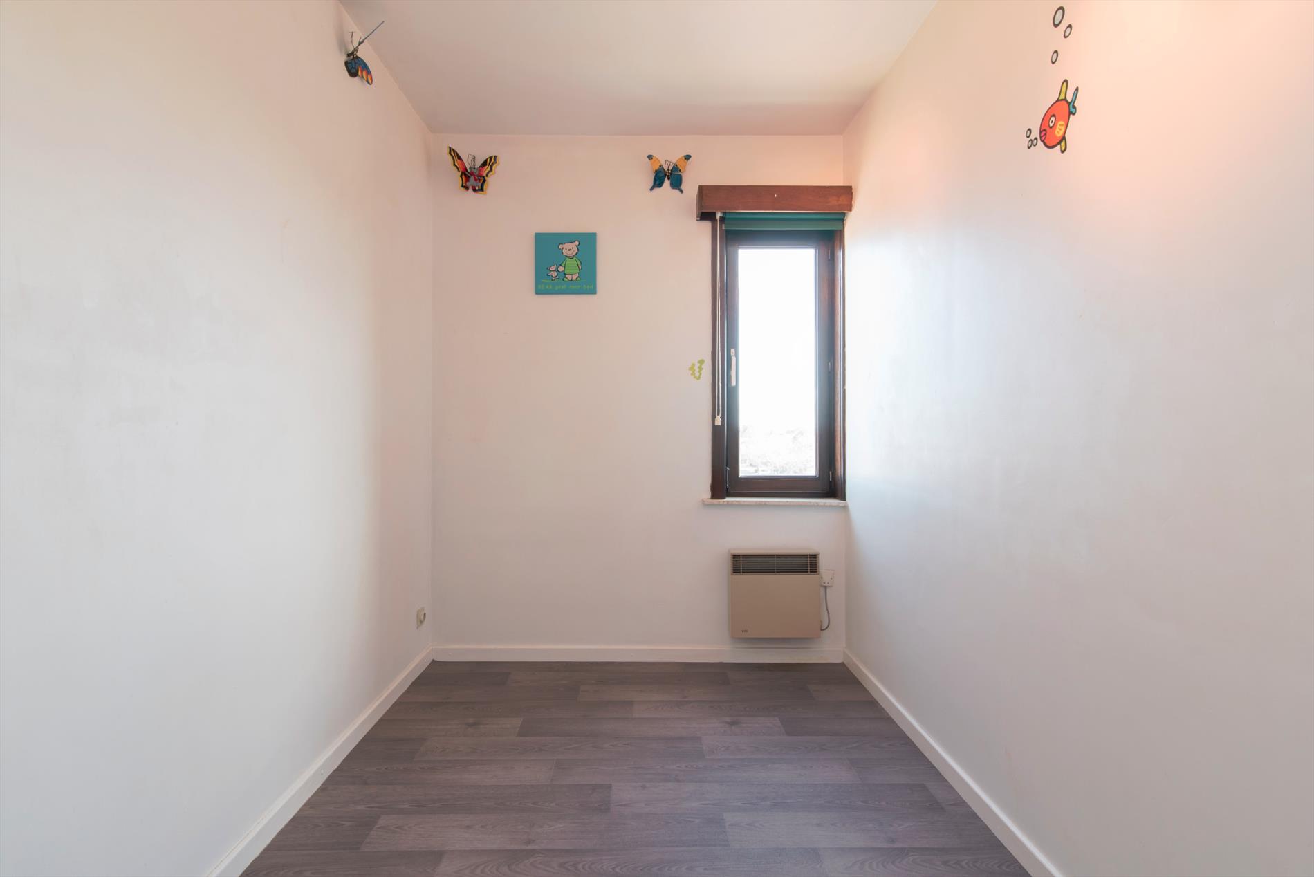 Tweede verdieping. Zonnige woonkamer met ruime zit- en eethoek. Terras met zijdelings zeezicht. Afzonderlijke ingerichte keuken. Badkamer met ligbad, wastafel, toilet en aansluiting wasmachine. Twee slaapkamers. Grote berging. Privé kelder. Zeer lage syndic kosten.