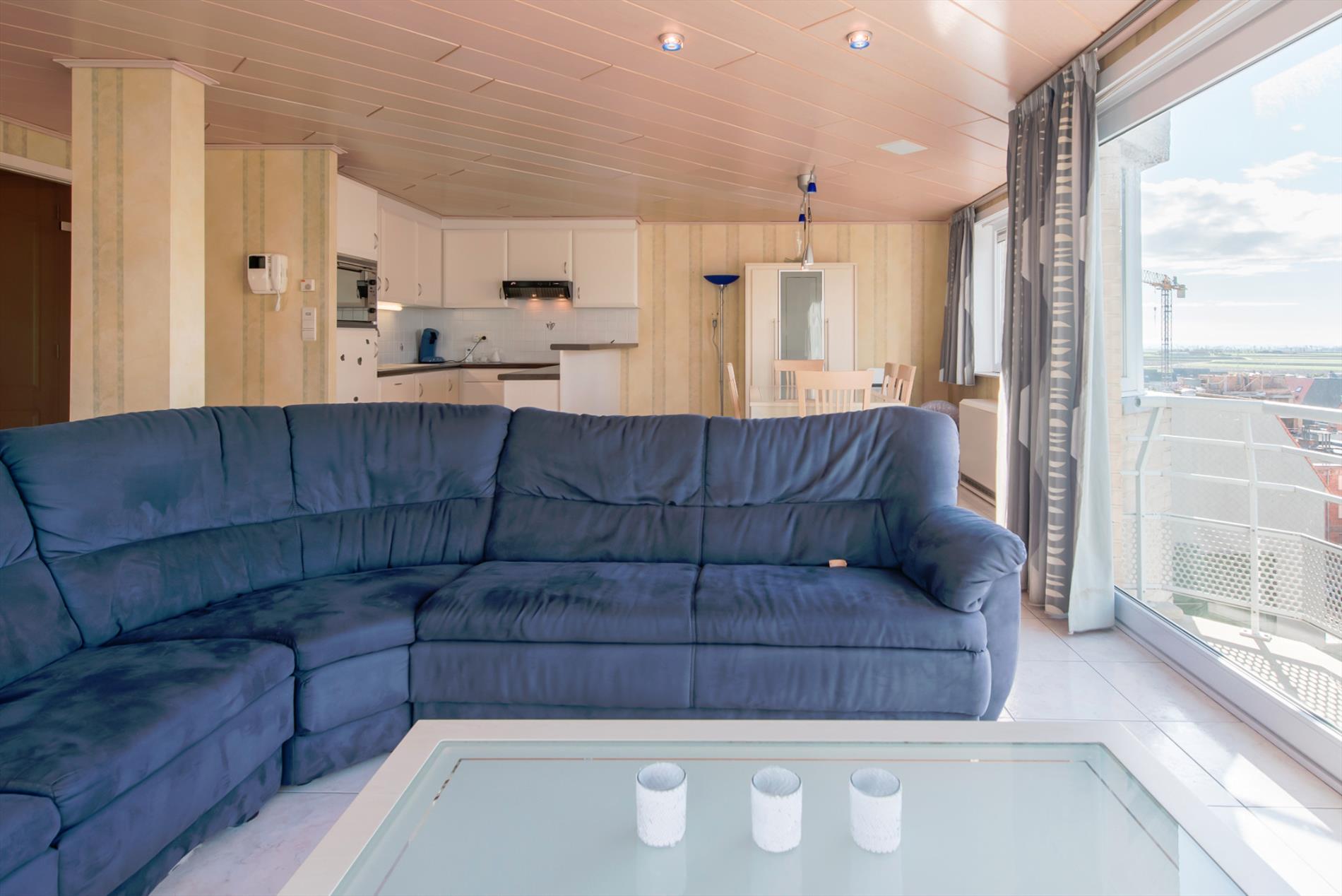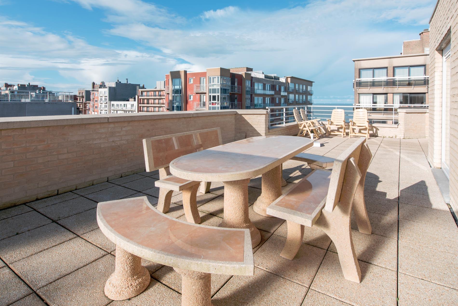 Prachtig duplex-appartement (121m²) met fantastisch dakterras (66m²) gelegen op de zevende verdieping. Ruime woonkamer met zicht op zee, dubbele eethoek en open keuken met alle modern comfort. 3 slaapkamers en 2 badkamers waarvan 1 met douche en 1 met ligbad. Mogelijkheid tot aankoop van een garage in het gebouw.