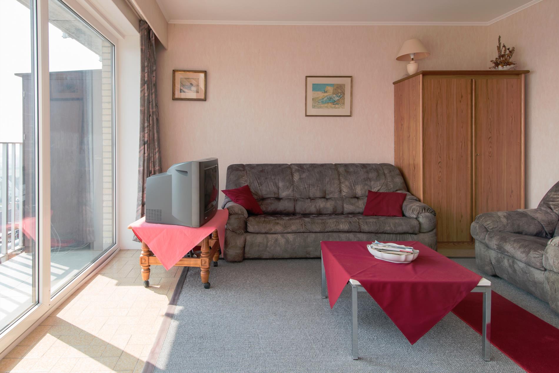 Mooie woonkamer met zonneterras over de volledige breedte. Aparte keuken met alle nodige comfort.