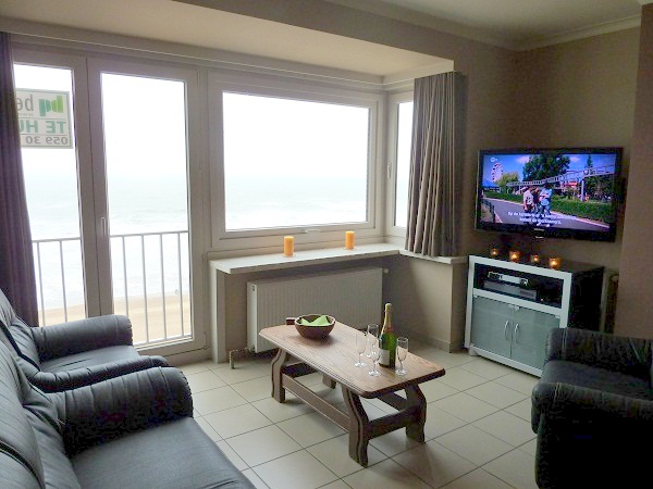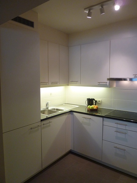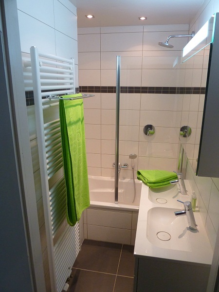 Agréable appartement avec vue sur la mer. Cuisine ouverte avec tout le confort Salle de bain avec baignoire et paroi de douche,