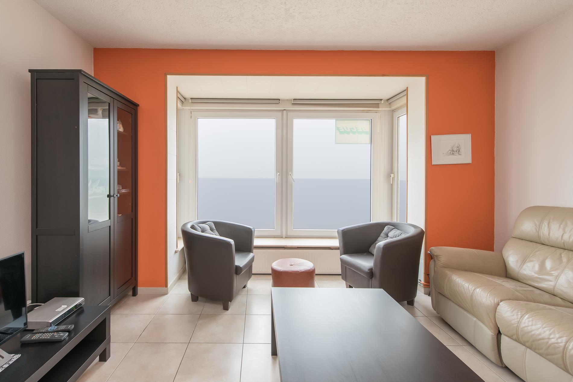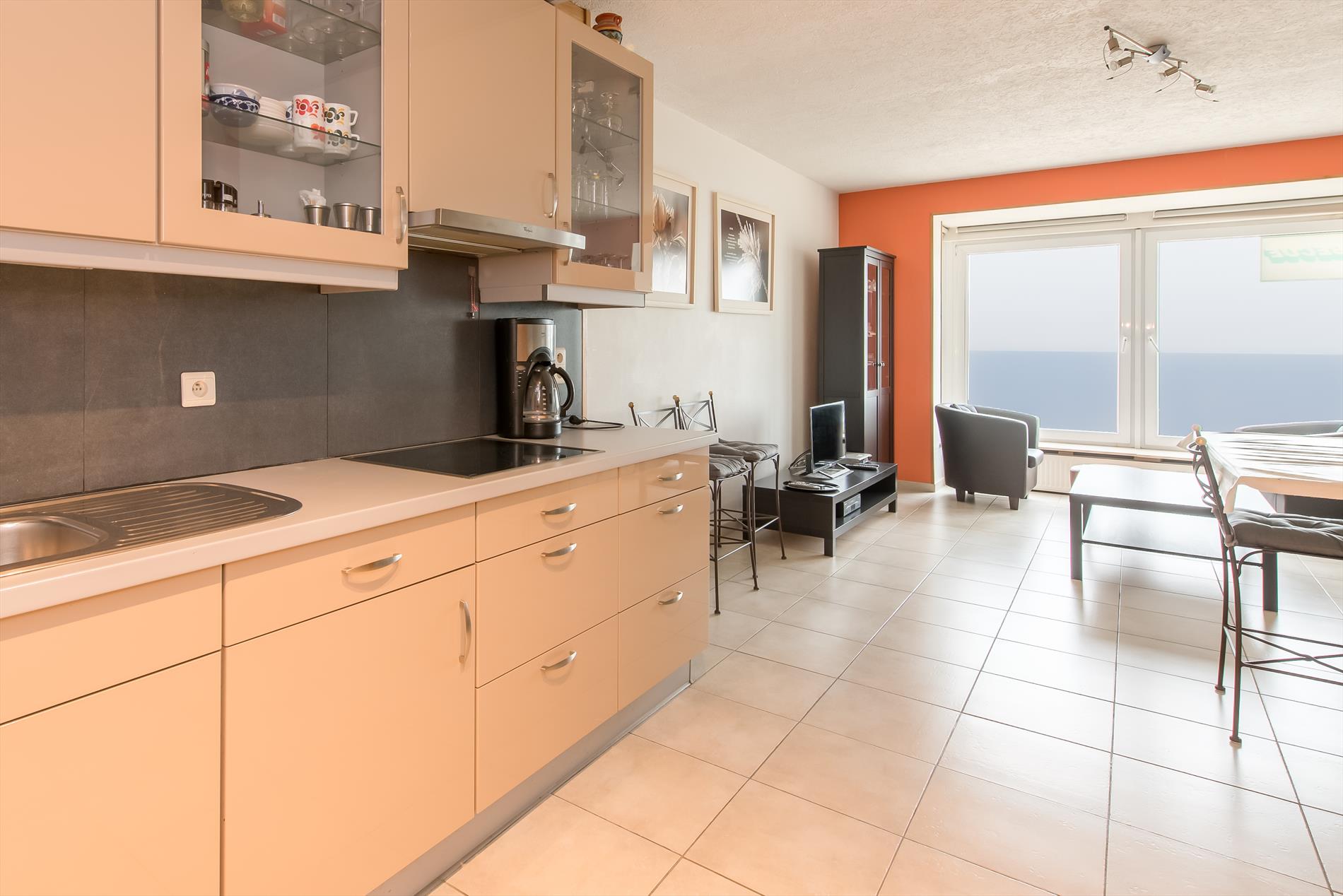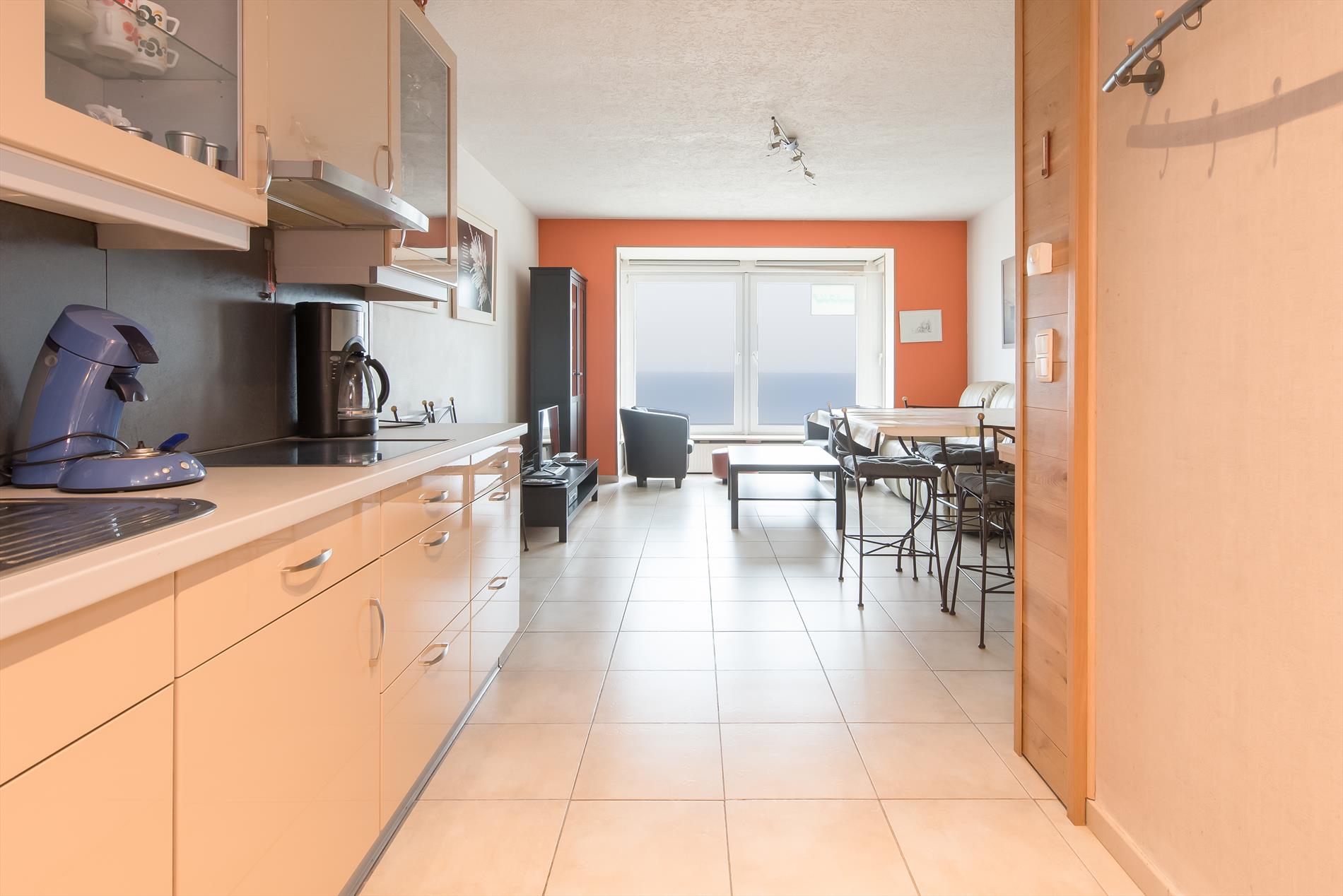woonkamer met een panoramisch zicht op zee. Open keuken met alle comfort. Klein droogterrasje
