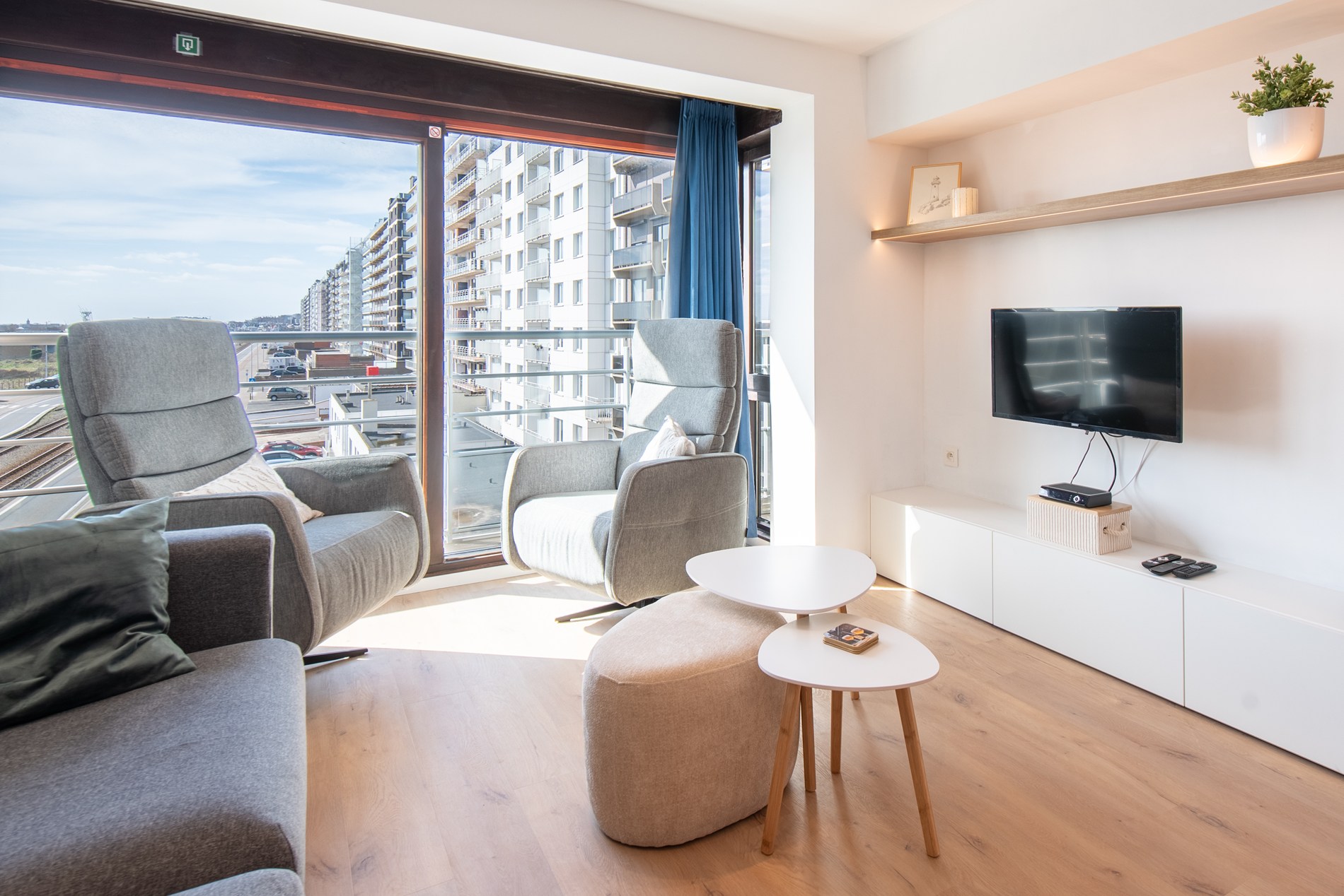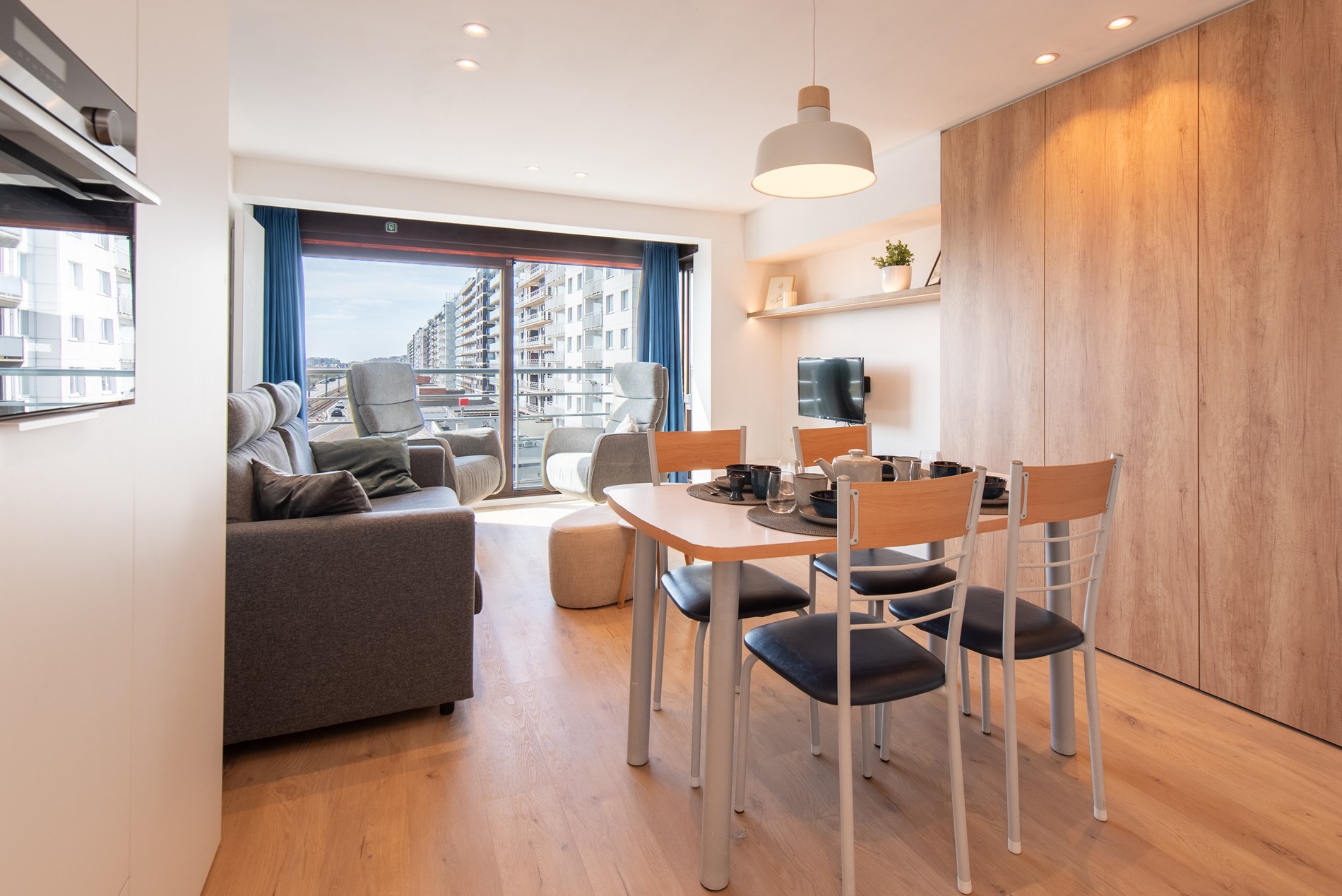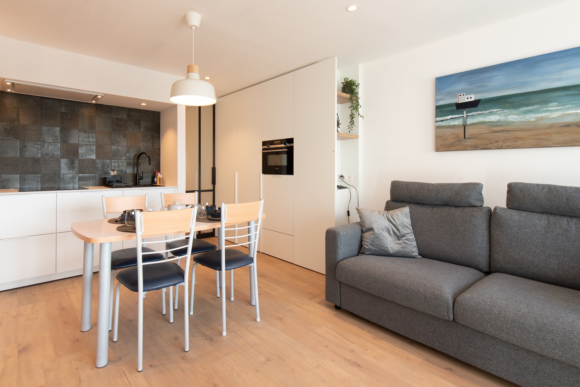 Gezellig appartement met zijdelings zicht op zee gelegen op de derde verdieping. Open keuken met alle modern comfort. Badkamer met inloopdouche en lavabo, apart toilet. Aparte slaapkamer met dubbel bed!
